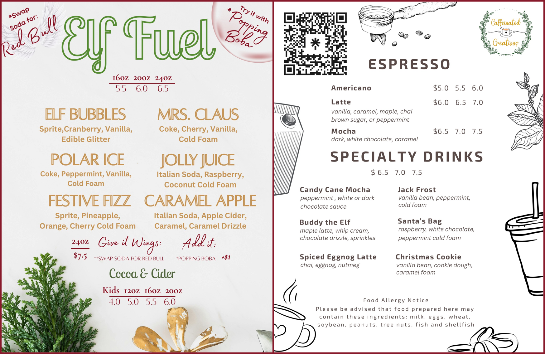 This year on Black Friday weekend we will have amazing coffee and hot chocolate available for purchase from our friends at Caffeinated Creations! Menu available here.